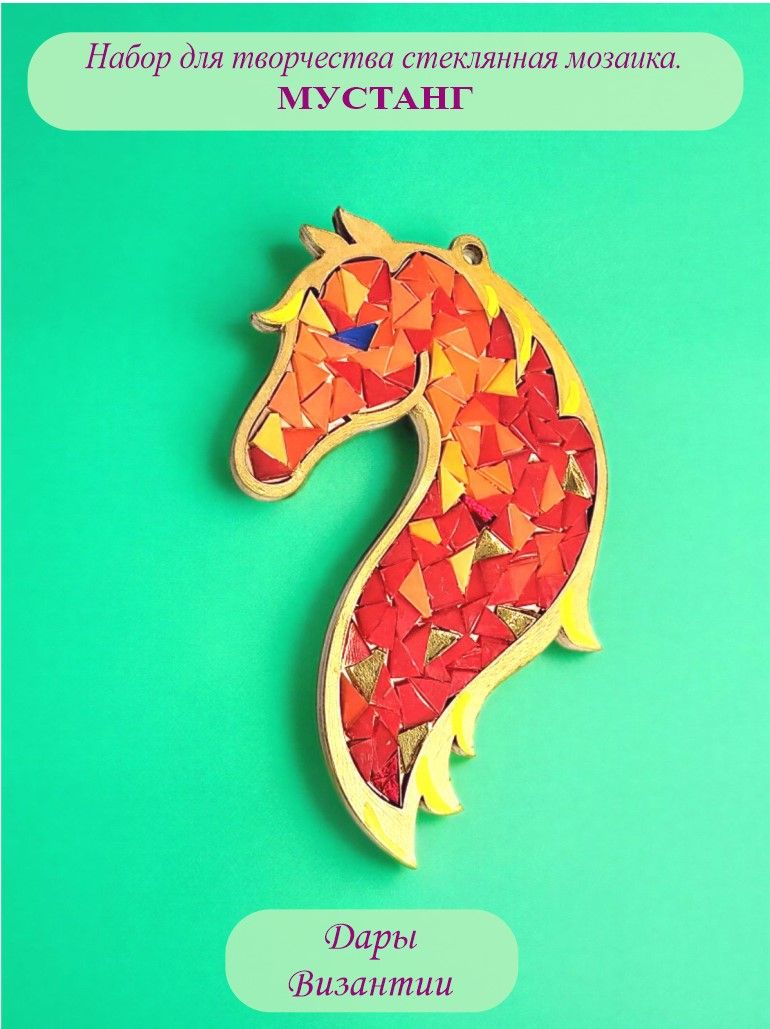 Набор для творчества Лошадь предлагает создать яркий декоративный элемент в виде стеклянной мозаики. Элементы с блестками обеспечивают насыщенный цвет и долговечность работы. Компактный комплект включает всё необходимое для сборки: основу, фрагменты мозаики и подробную инструкцию.
