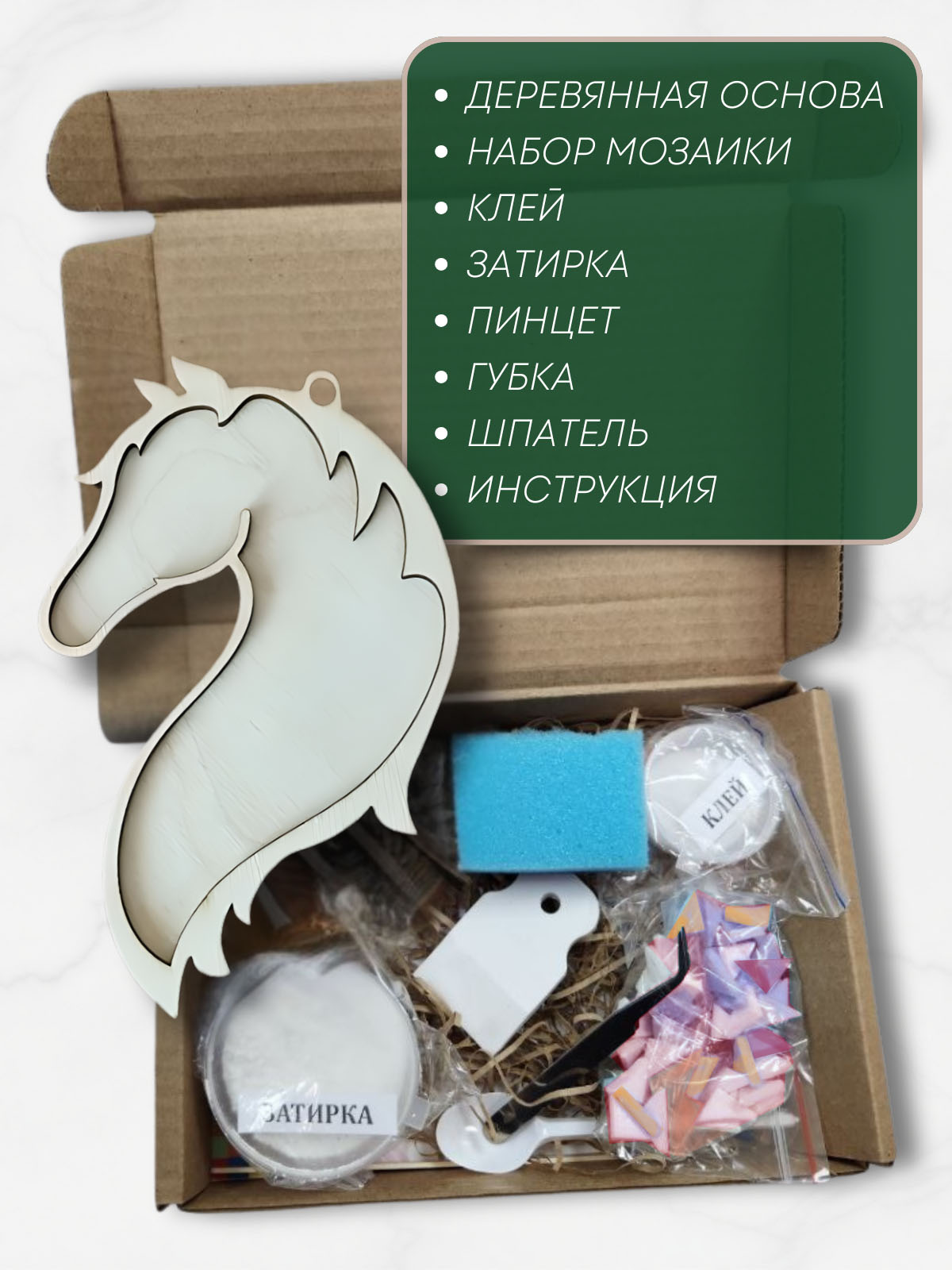 Форма из березовой фанеры, цветное стекло, клей, затирка, шпатель, пинцет, инструменты, коробка, инструкция