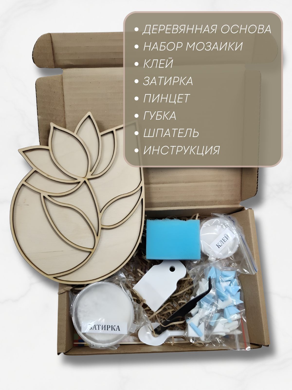 Набор для творчества мозаика представляет собой увлекательный комплект для детей и взрослых. Этот набор станет прекрасным подарком для девочек и мальчику. Товары для творчества развивают воображение и мелкую моторику детей. Мозаика из набора позволяет создавать уникальные предметы декора. Форма из фанеры служит основой для будущей композиции. Клей надежно фиксирует элементы мозаики на поверхности.